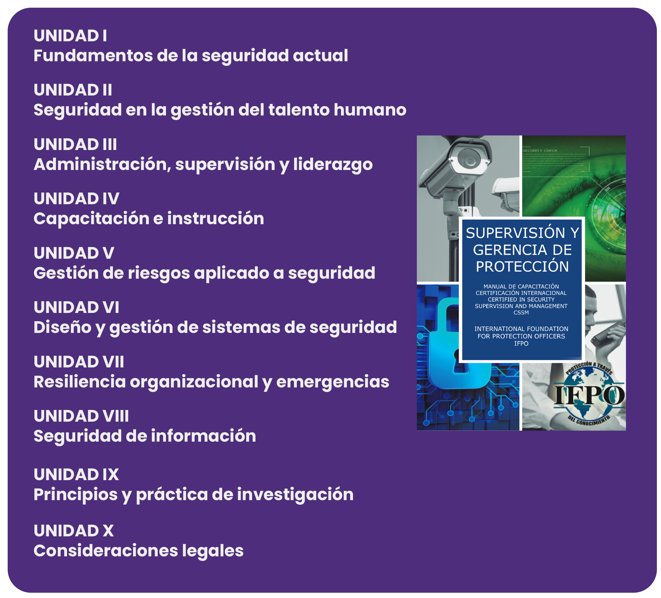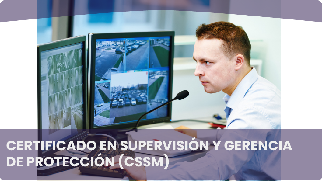 La certificación internacional en Supervisión y Gerencia de Protección (Certified in Security Supervision and Management) – CSSM©, es un testimonio de la competencia laboral en la gestión y supervisión de la Protección Integral. Esta certificación avala la competencia en áreas como la Gerencia de Operaciones de Seguridad, Supervisión de Campo, Coordinación, Dirección de Departamentos de Seguridad Física, y Gerencia en empresas de Seguridad Privada. Está diseñada para beneficio de Supervisores y Gerentes de Seguridad Integral que buscan mejorar sus habilidades y conocimientos en este campo especializado.