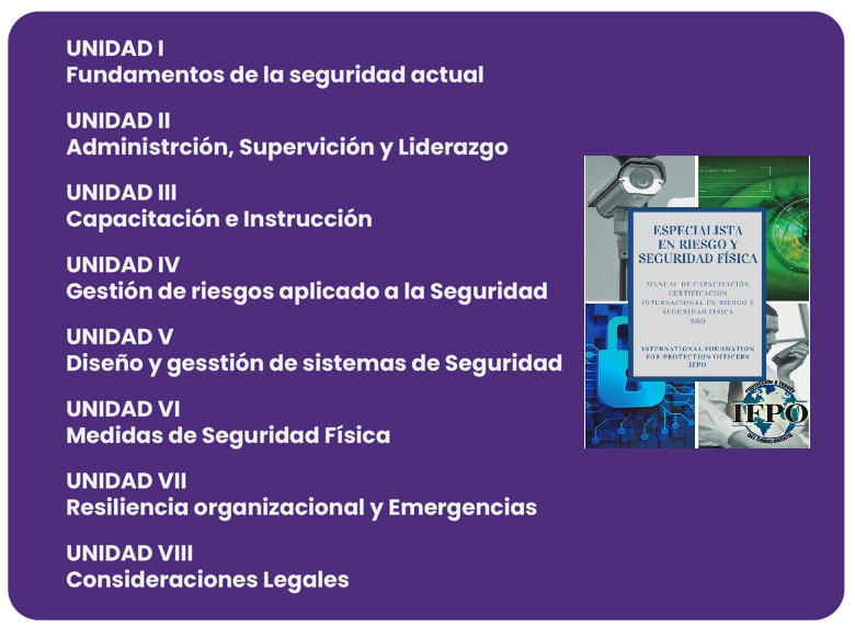 • Material adicional (estándares, listas de chequeo y formatos). Licencia oficial por un año para la toma de examen SRO© de IFPO©. Segunda oportunidad de examen.